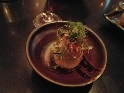 When reservations are made, there are 4 options: The Chef's Table, which is 7 courses and located in the kitchen. That is the most expensive option, but it is also the most limited option, with possibly two seatings a night. In the lounge, you can opt for a 5 course, 3 course, or a la carte choice. If you decide to go with a Prix Fixe menu, there are no substitutions, but you can augment your menu if you so desire. I decided to go with a 5 Course which also came with small food pairings. We started out with a drink called Return of the MAC, which was a combination of Orange, Thyme, Pimento Dram, Apple Brandy, and Cider Spices. It was served to us in a vessel called a Porthole that looked very much like an old style canteen. The canteen acted as an infuser and the flavor and appearance of the drink changed as time went by. It started red and sweet, but became more red, less sweet, and more spicy as time went by. Paired with the drink was a very good Takoyaki, a deep fried ball of dough with finely chopped octopus. It was tender and flavorful with a little spice, and it went well with the drink.